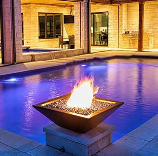 This 24-inch square bowl delivers 45,000 - 65,000 BTUs (depending on model selected) with a stainless-steel burner, has a 15 GPM water flow rate, and includes lava rock, with an upgrade option for fire glass (see fire glass in accessories). Available with Match Lit or 12V Electronic Ignition, it includes a drainage-equipped fire pan. An optional key valve (sold separately) enhances gas control. Choose from various sizes and finishes, all backed by a 1-year warranty.